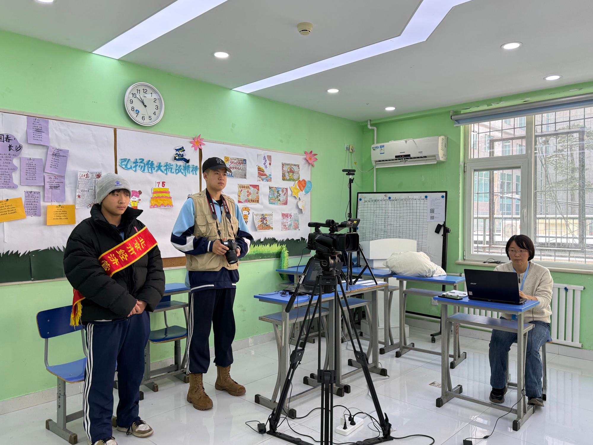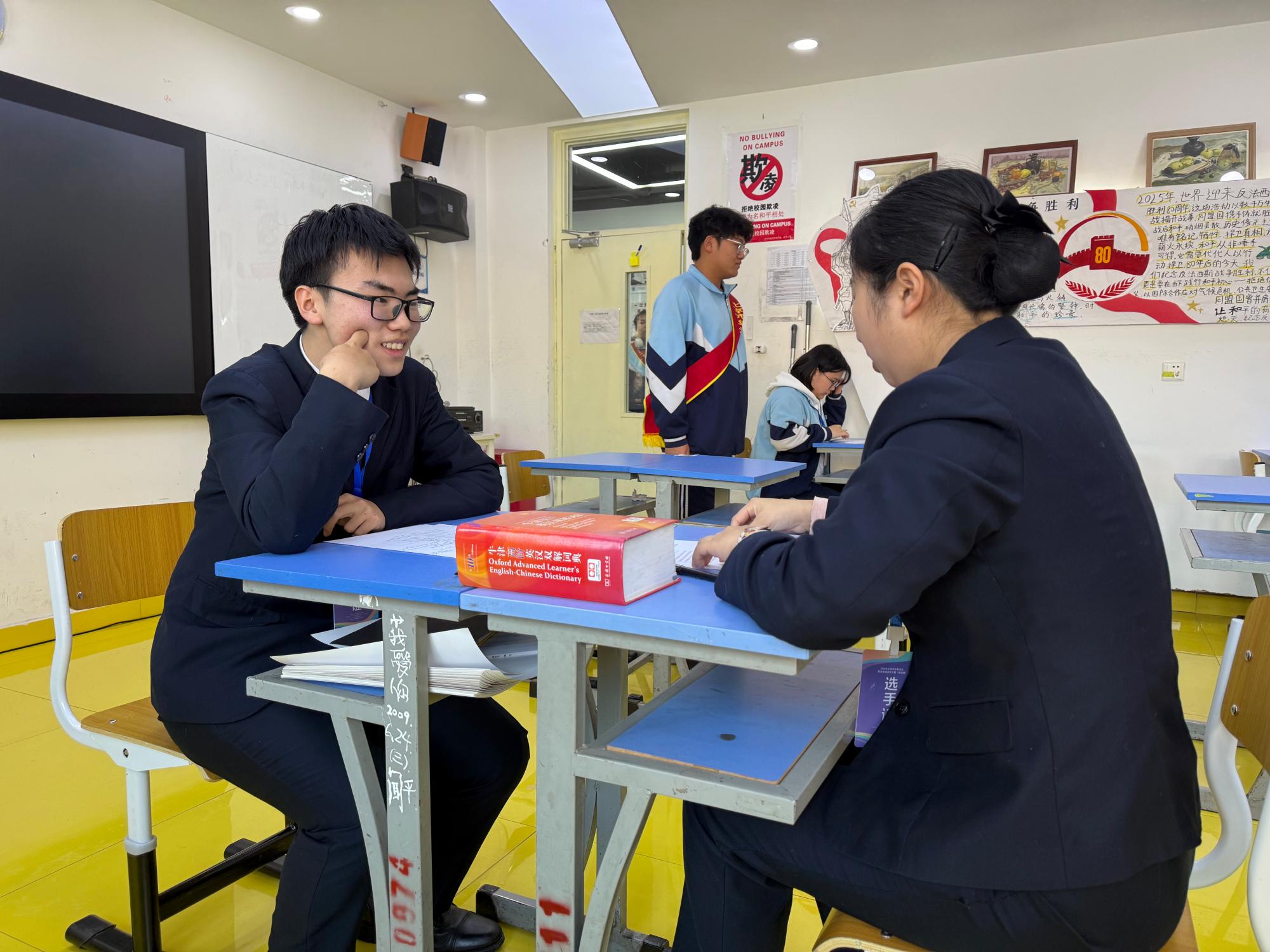 比赛分为通用英语测试、演讲答辩和职场应用三个环节。通用英语测试环节采用上机测试,重点考察选手的听力和阅读能力。演讲答辩环节以“纪念抗日战争及世界反法西斯战争胜利80周年”为主题,选手们围绕抗战胜利的光辉历程、传承抗战精神、弘扬伟大民族精神、凝聚文化自信等方面进行演讲,他们还表示作为中职的学生要弘扬和传承抗战精神,充分发挥自己的专业技能,为祖国的繁荣富强贡献力量。英语职场应用环节考察选手对所给任务信息进行分析、筛选,用英语交流分工协作完成任务的能力。此外,演讲答辩和职场应用两个环节都有选手与评委互动问答的部分。今年的职业英语技能大赛较之以往比赛,出现了英语职场应用能力增强、演讲声情并茂、服装道具准备充分等特点。两位俄罗斯的交换生也慕名而来参加此次大赛。