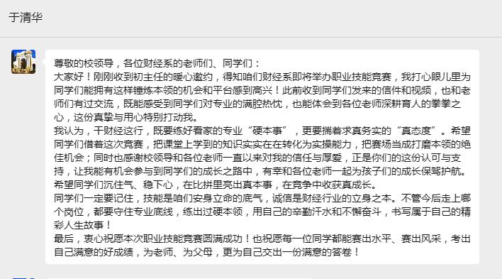 赛前,全国劳模于清华同志通过微信的方式向同学们表达了殷切的期望与诚挚的寄语,他叮嘱到:“同学们一定要记住,技能是咱们安身立命的底气,诚信是财经行业的立身之本。不管今后走上哪个岗位,都要守住专业底线,练出过硬本领,用自己的辛勤汗水和不懈奋斗,书写属于自己的精彩人生故事!”