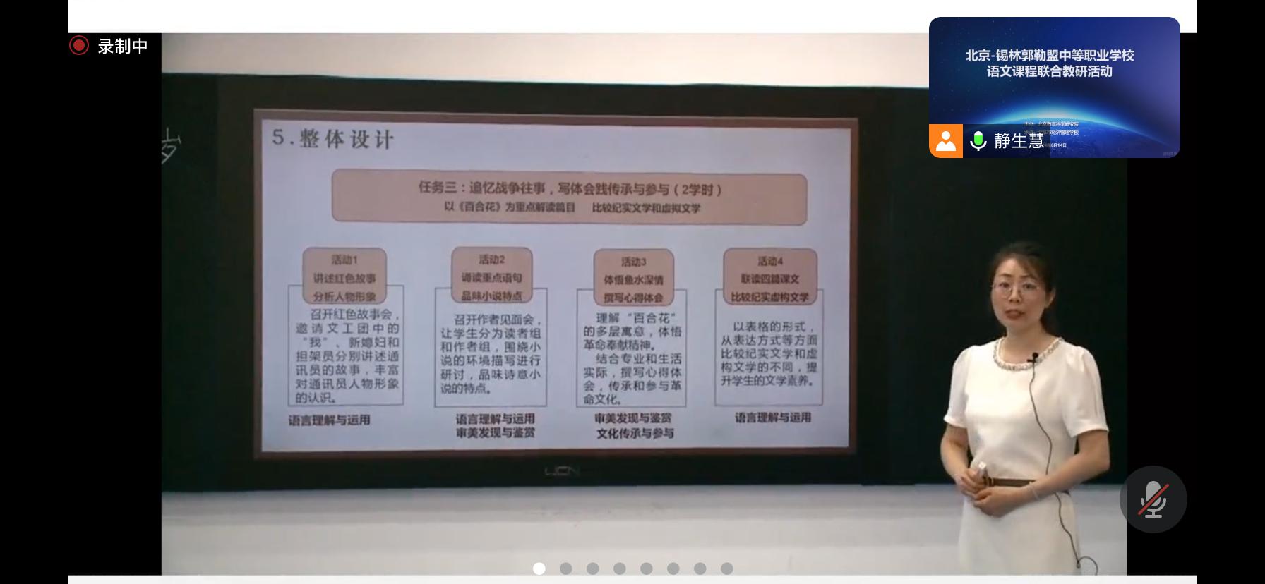 其次,我校王凤老师作了题为《历史的记忆——中国革命传统作品选读专题的教学设计》的说课展示,从专题提出背景、课标要求、教材分析、教学目标和实施过程等方面展开介绍,讲述了新课标视域下专题教学的设计思路。