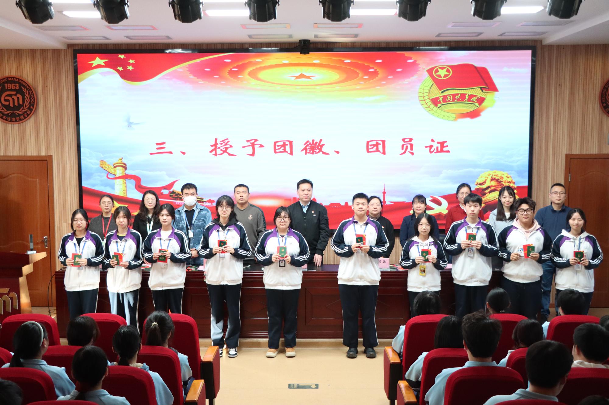 党的二十届四中全会擘画了“十五五”发展宏伟蓝图,为青年一代锚定了奋进航向。为加强我校共青团组织建设,激励广大青年学生坚定理想信念,校团委于11月19日组织125名2025年度新发展团员进行了庄严而富有意义的入团仪式。校党委委员、德育副校长杨明远、党群工作部主任刘月远、思政文体部主任于波、团委书记吴丹和各年级班主任代表等10余位老师亲临现场,共同见证这一光荣而神圣的时刻。
